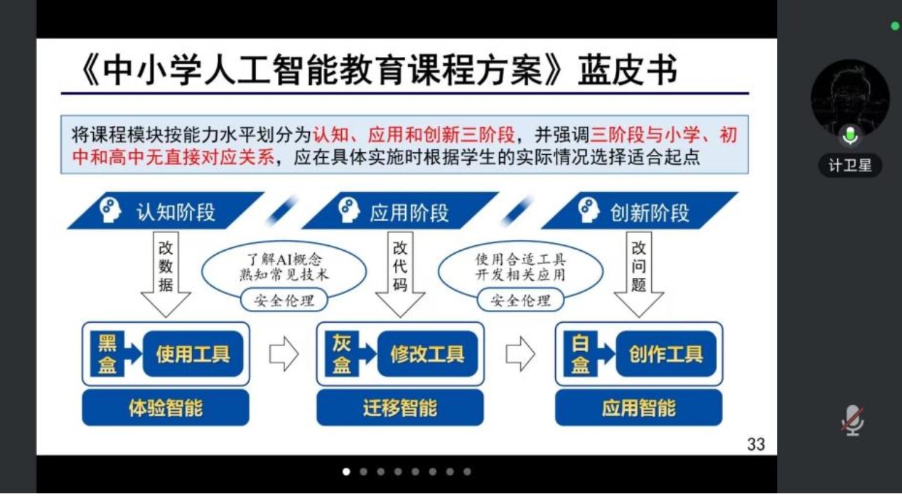 计卫星教授从国内中小学人工智能教育的政策与资源布局讲起,系统梳理了近年来北京、天津、广东等六省市推出的人工智能教育实施方案,以及华东师范大学、北京师范大学、首都师范大学等高校与中央电化教育馆发布的课程指南、教学服务平台及研究蓝皮书,清晰呈现了当前中小学人工智能教育的政策支持体系与资源建设格局。