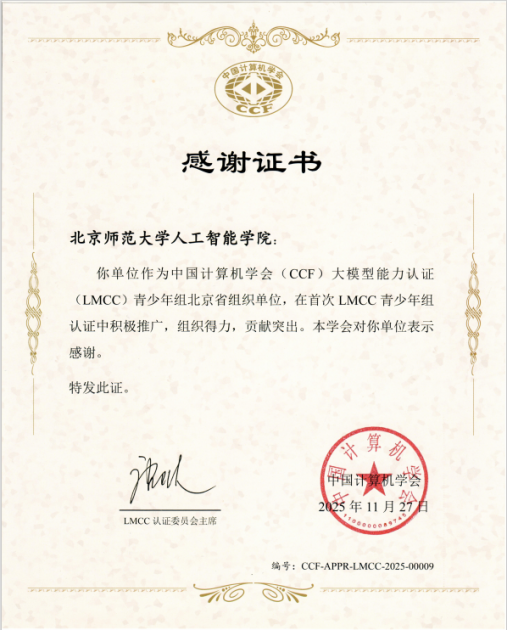 此次表彰,是学院在青少年人工智能教育领域的重要成果。学院将以此次表彰为动力,持续完善“人工智能+教育”人才培养体系,加强与CCF及各区域组织的协同合作,推动大模型技术在教育领域的科学普及与规范发展,为提升青少年人工智能素养、培养拔尖创新后备人才贡献更多“北师力量”。