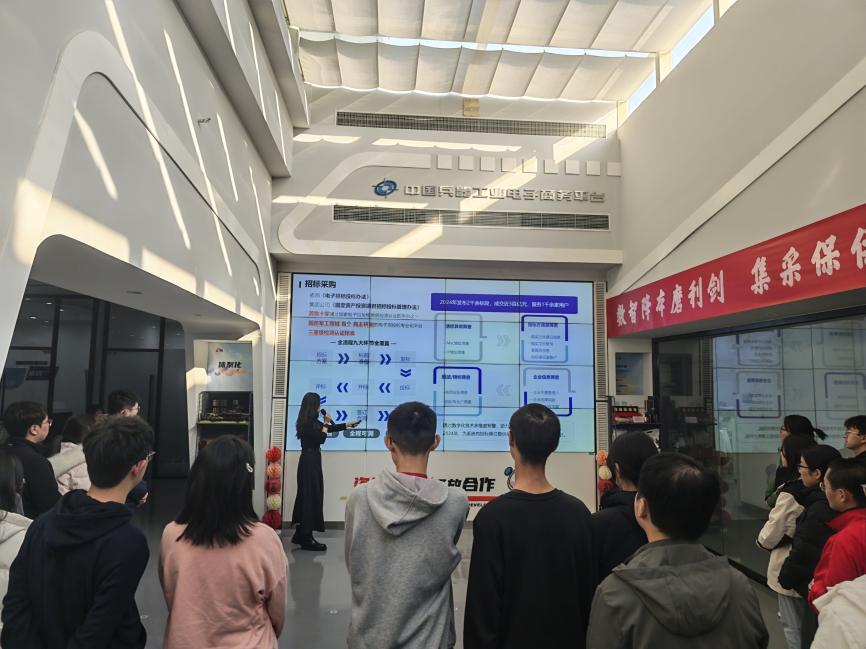 随后电子商务事业部同事为同学们详细的讲解了中国兵器工业电子商务平台,展现了一站式数字化服务在集团业务中的全面应用,帮助大家对企业机制有了更系统的理解。最后师生们来到公司的物流安保中心,在这里同学们见到了一张巨大的“网”,公司业务范围内的在途运输车辆全部接入了这张大“网”之中,依托人工智能和人脸识别技术,实现运输风险的实时预警与动态防控,最大限度的保障物资运输的安全可靠。