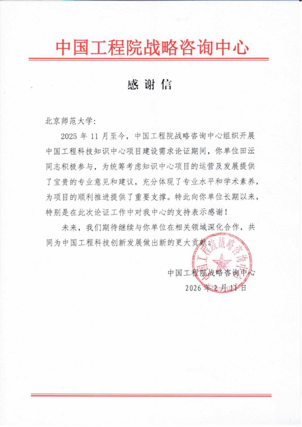 近日,我院收到来自中国工程院战略咨询中心的感谢信。信中高度评价并诚挚感谢了我院田沄教授在中国工程科技知识中心项目建设需求论证期间所做出的突出贡献与辛勤付出。