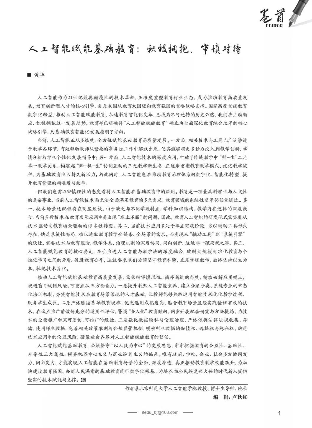 【观点】北京师范大学人工智能学院院长黄华——人工智能赋能基础教育:积极拥抱、审慎对待