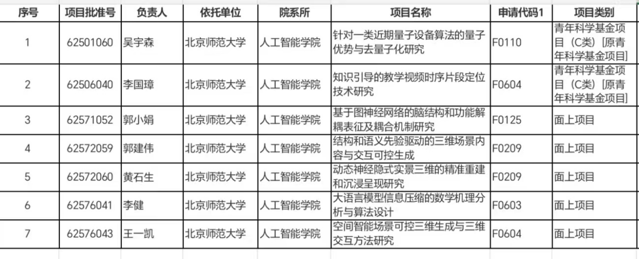 2025年8月27号,国家自然科学基金委员会公布2025年度国家自然科学基金项目评审结果。北京师范大学人工智能学院在本次申报中一举获批七项基金项目,其中包含面上项目5项,青年科学基金项目(C类)2项。