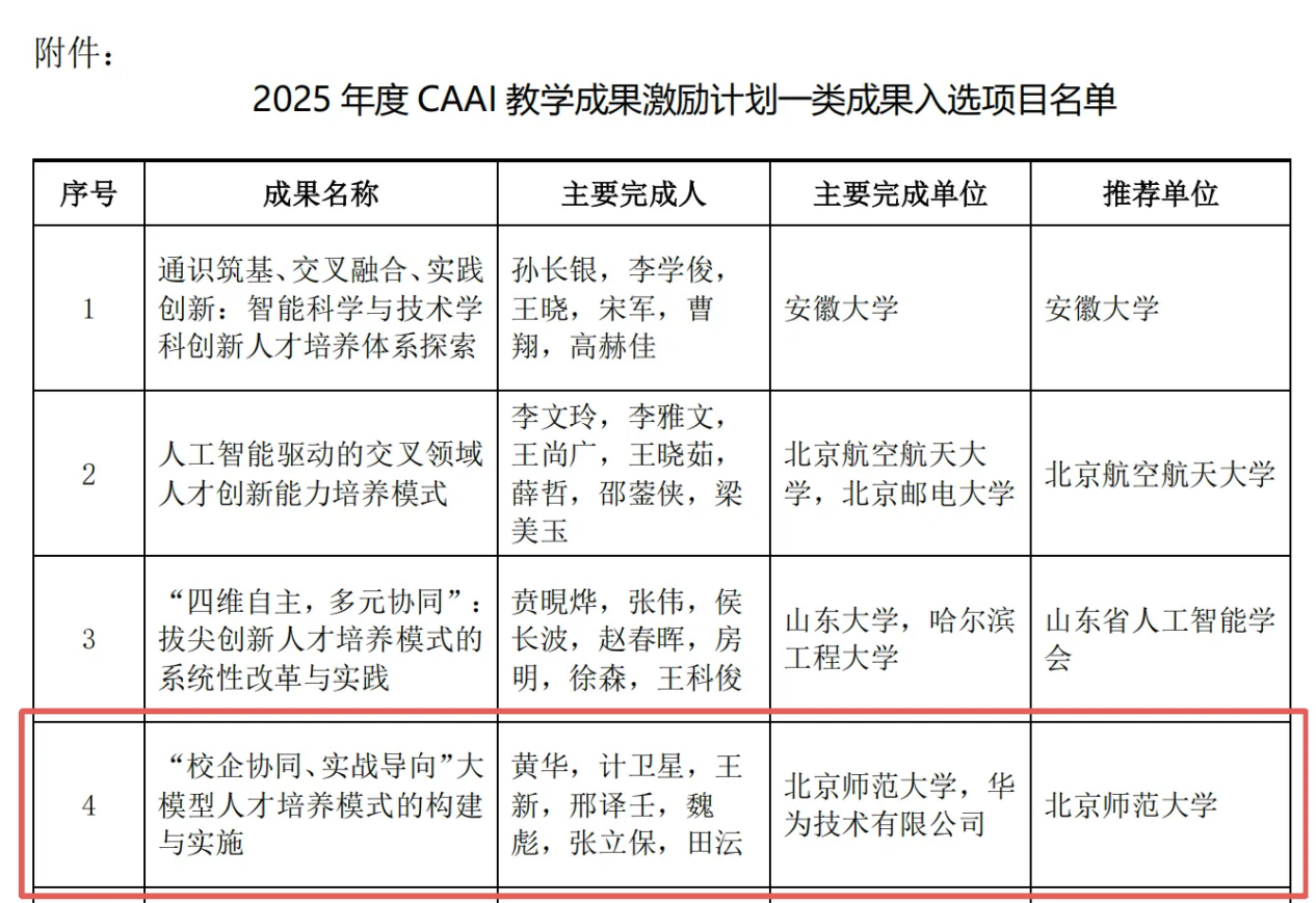 近日,在中国人工智能学会(CAAI)组织的2025年度教学成果激励计划评选中,由我院黄华教授牵头,与华为技术有限公司合作完成的“‘校企协同、实战导向’大模型人才培养模式的构建与实施”成果,荣获2025年度CAAI教学成果激励计划一类成果奖。
