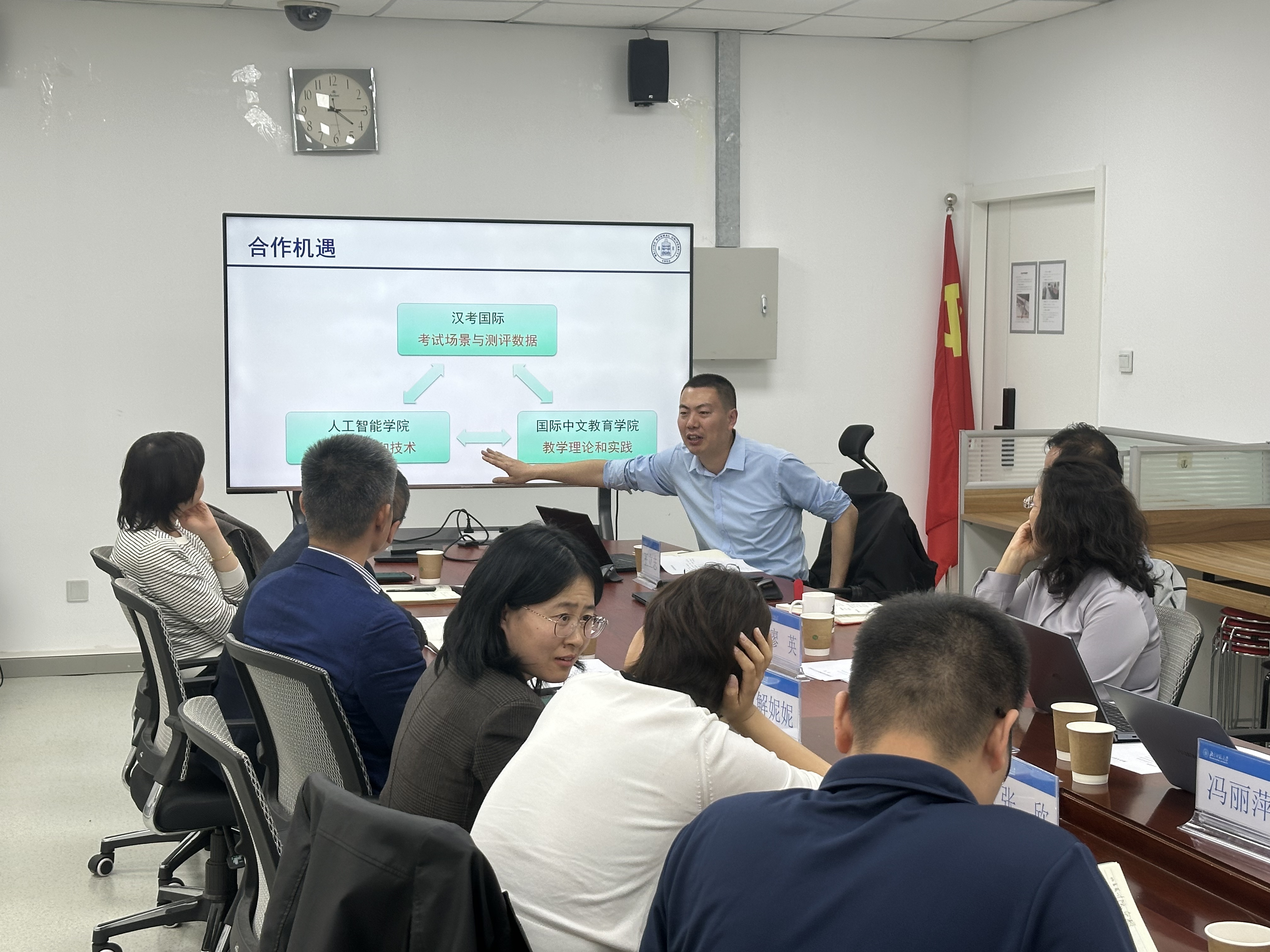 会上,人工智能学院详细介绍了学院在人工智能赋能教育领域所取得的成果与未来发展规划。汉考国际方面介绍了企业发展状况,并深入分析了国际中文考试对人工智能技术的迫切需求与广阔应用前景。国际中文教育学院着重阐述了国际中文教学所面临的国家需求及学院的业务进展。