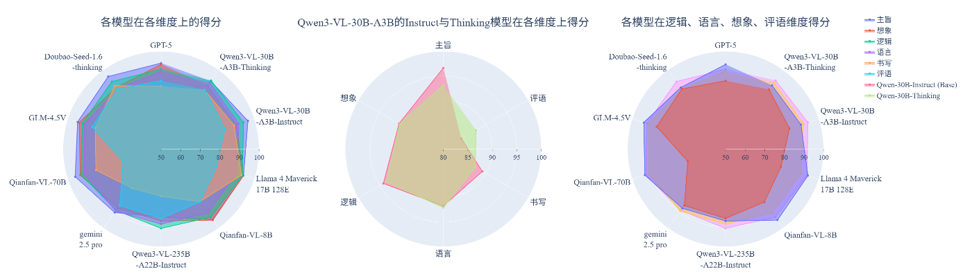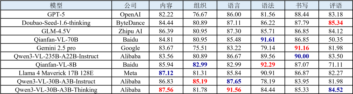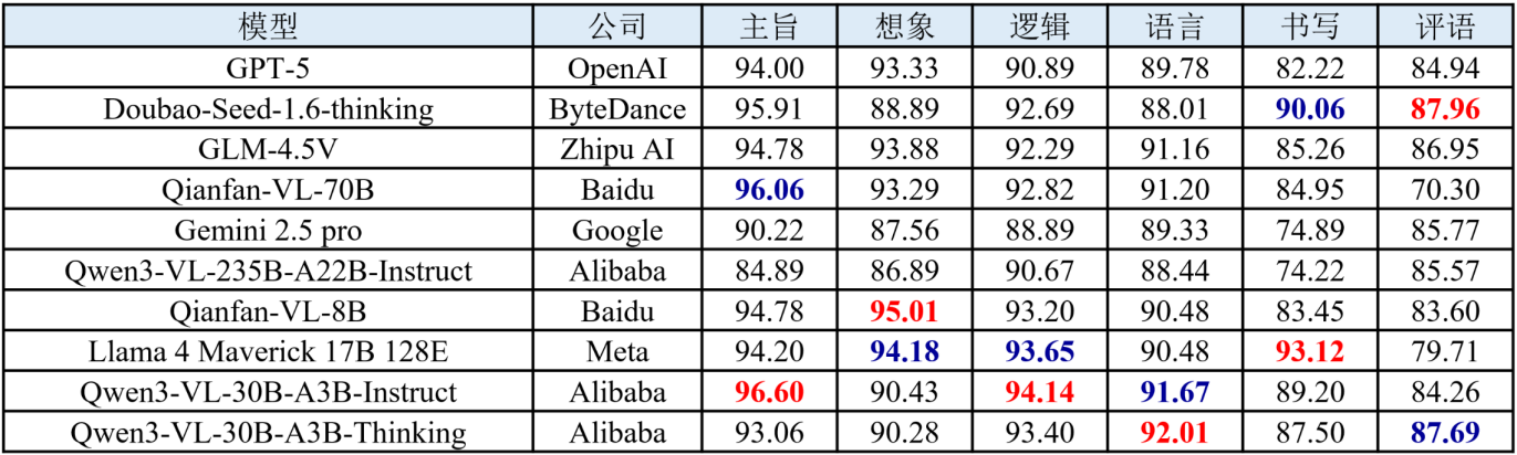 (3) 语言与逻辑维度表现稳健,想象与评语维度仍为关键短板。在语言、逻辑、语法等规则性和结构性较强的维度上,各模型均能维持较高得分,表明当前大模型在语言建模与逻辑关联方面的基础能力已相对成熟。然而,在想象、评语等维度需要更高层次抽象理解与创造性表达的维度上,模型间差距明显且整体表现偏弱。