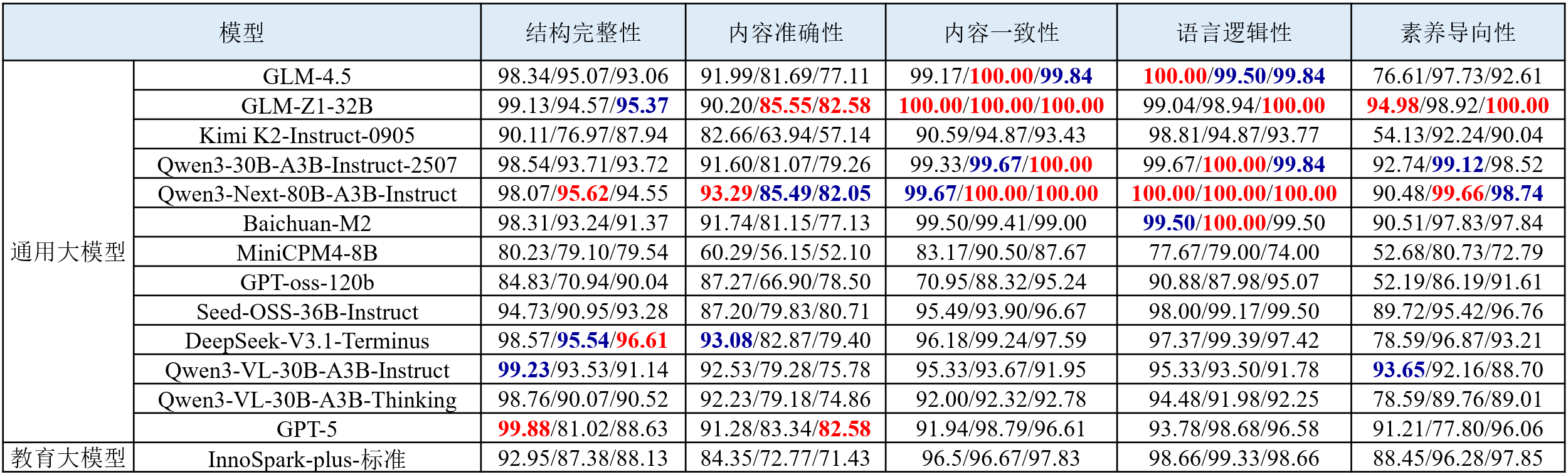 教案生成评测任务旨在从结构完整性、内容准确性、内容一致性、语言逻辑性和素养导向性等维度全面评测大模型生成初中数学、物理和化学三门学科教案的能力。评测结果如下表所示。