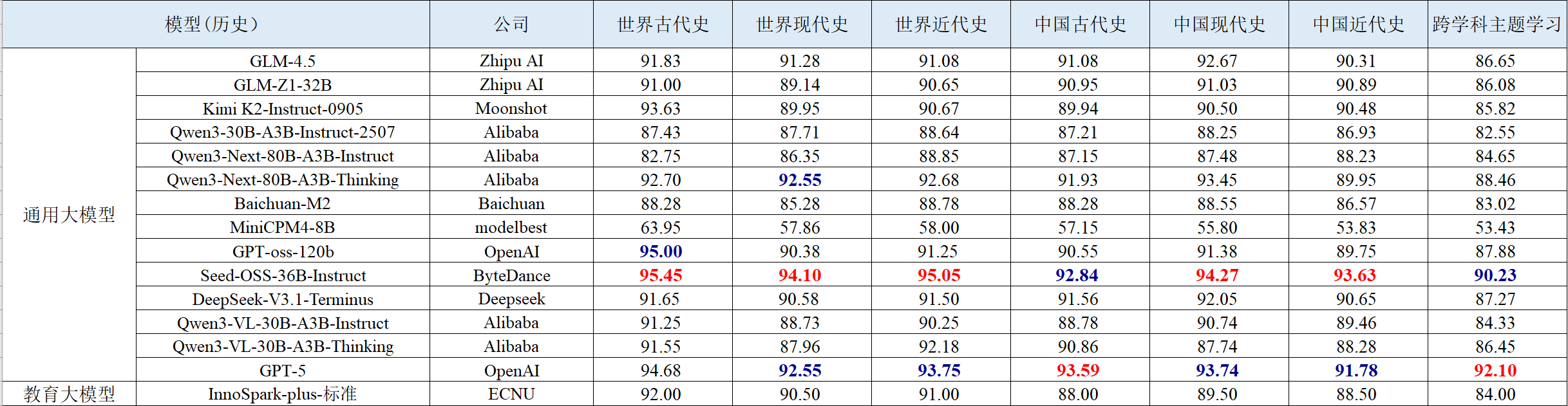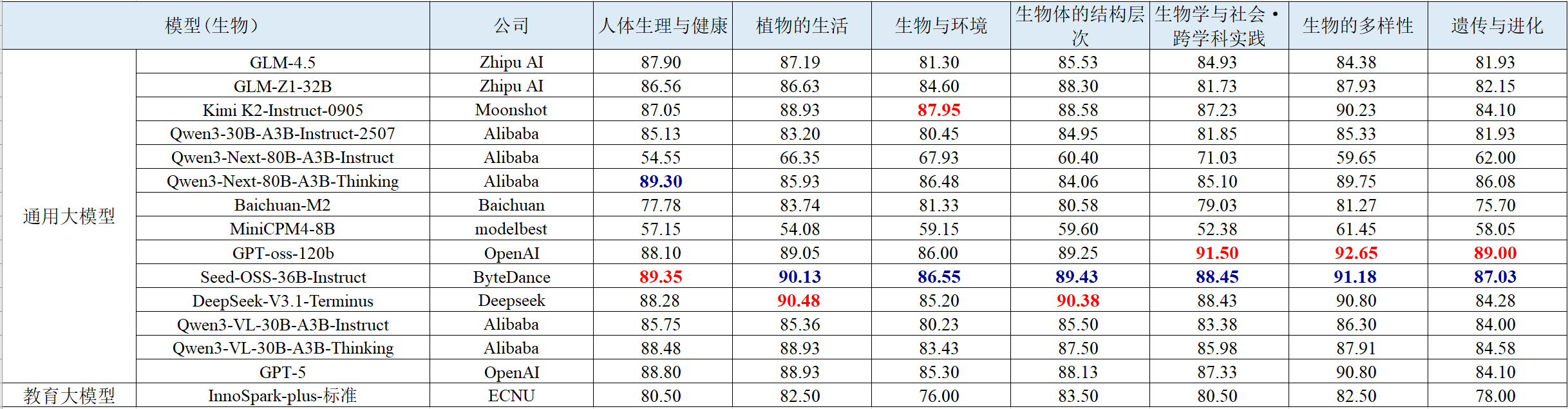 教育专业能力聚焦初中解题场景,覆盖语文、数学、英语、物理、化学、生物、历史、地理、信息科技 9 大核心学科,包含客观题和主观题,依据新课标课程内容制定每门学科的细粒度评测维度。评测结果如下表所示。