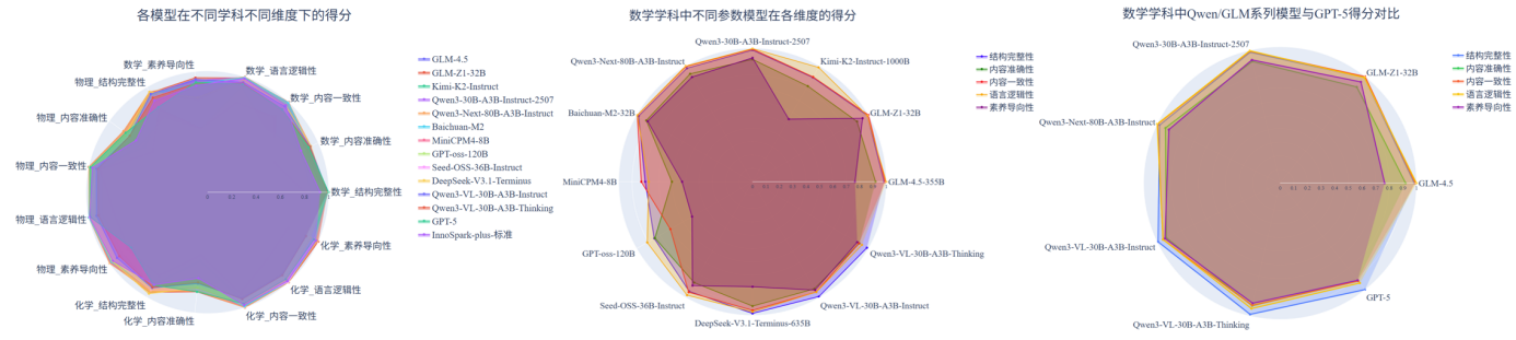 (2) 国内主流系列模型在知识与解析能力上持续提升。与上一期榜单相比,国内头部模型在核心生成指标上普遍提升,特别是Qwen3系列在知识点匹配度与解析准确性维度上均稳步提升,其中Qwen3-Next-80B-A3B-Instruct在物理与化学学科的解析准确性上较之前的模型均有明显提升。此外,GLM-4.5相较于其前代GLM-4,也在所有维度上实现提升。