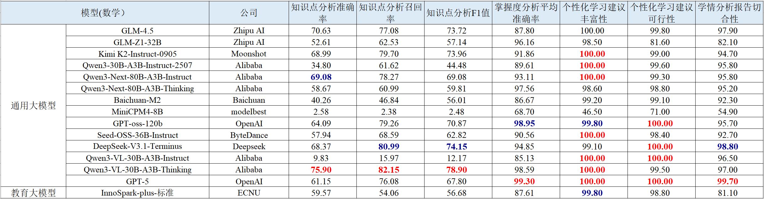 (1) 相较首期榜单,模型在个性化学习建议任务上性能提升。此次评测的多款模型在个性化学习建议相关维度上性能提升明显,其中Qwen系列即使在小规模参数量下依然发挥优异,这表明在目标明确、框架清晰的特定应用任务上,模型优化已取得一定进展,且模型能力不完全依赖于参数规模。