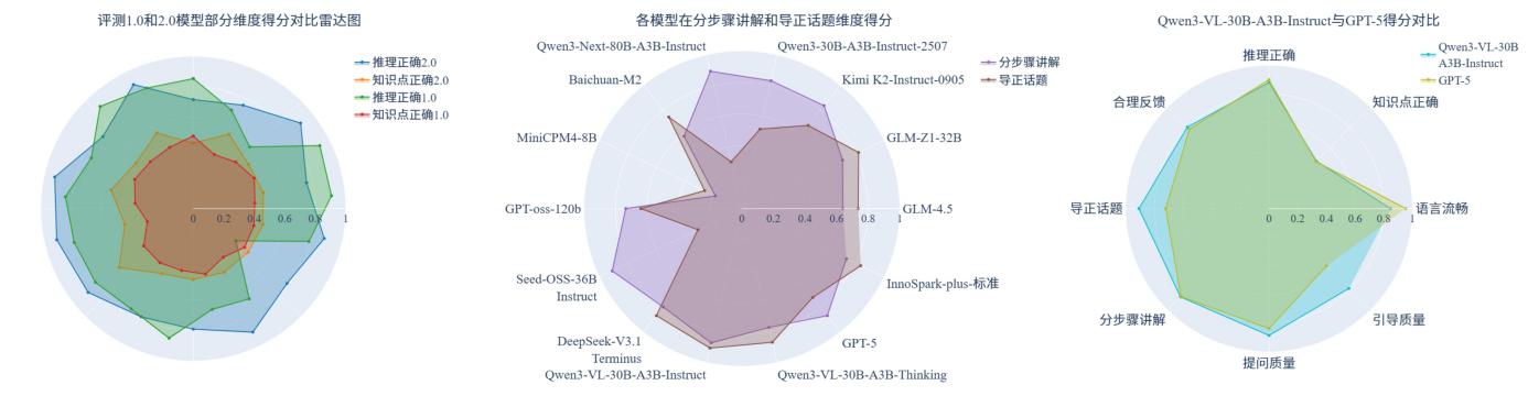 (3) 对比国内外同系列模型,Qwen系列最强模型在八个维度上的整体表现略优于GPT-5。具体而言,相较于GPT-5,Qwen3-VL-30B-A3B-Instruct在引导质量、提问质量和导正话题等维度表现更为出色,显示出其在逐步引导以启发学生思考和及时纠正学生话题偏离方面的潜力。然而,在语言流畅维度上,Qwen系列得分偏低,GPT-5在该维度仍保持领先优势。