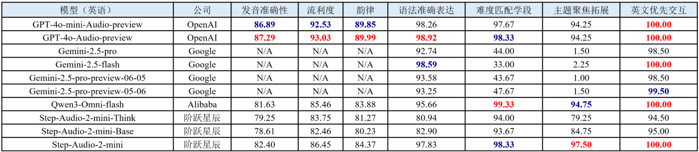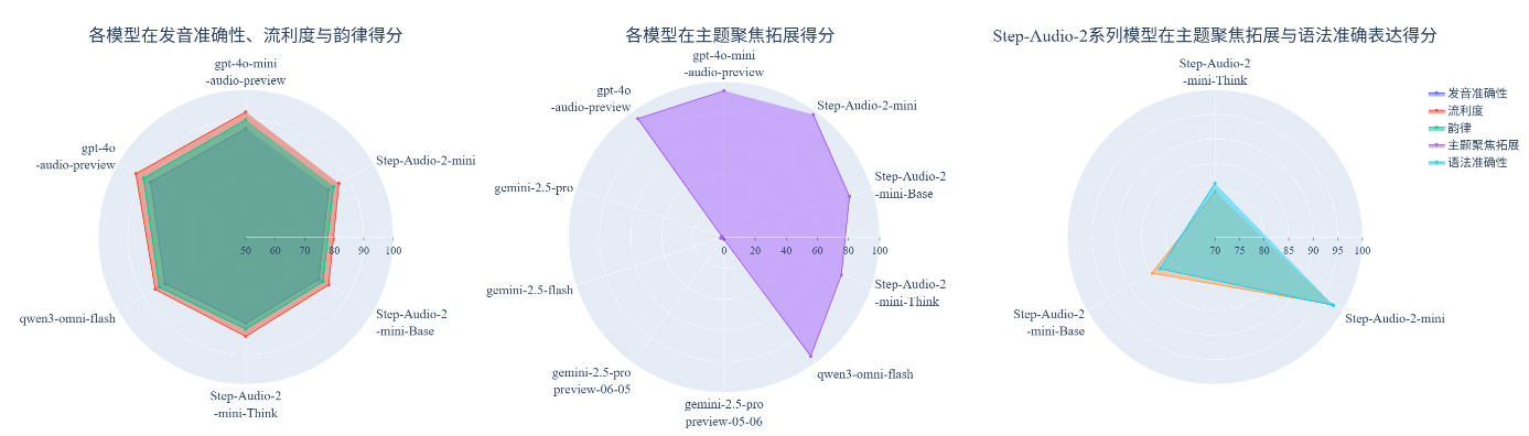 (2) 主题聚焦拓展成最大差异化维度,国产模型表现突出。Gemini系列在该维度的表现相对有限,虽然在文本任务上表现优异,但其技术并未能平滑迁移到需要高频互动的口语练习场景中。相比之下,国产模型如Step-Audio-2-mini和Qwen3-Omni-Flash在该维度上实现性能提升,尤其在对话连贯性和内容拓展能力上,展现出更好性能,提升了用户的口语训练体验。
