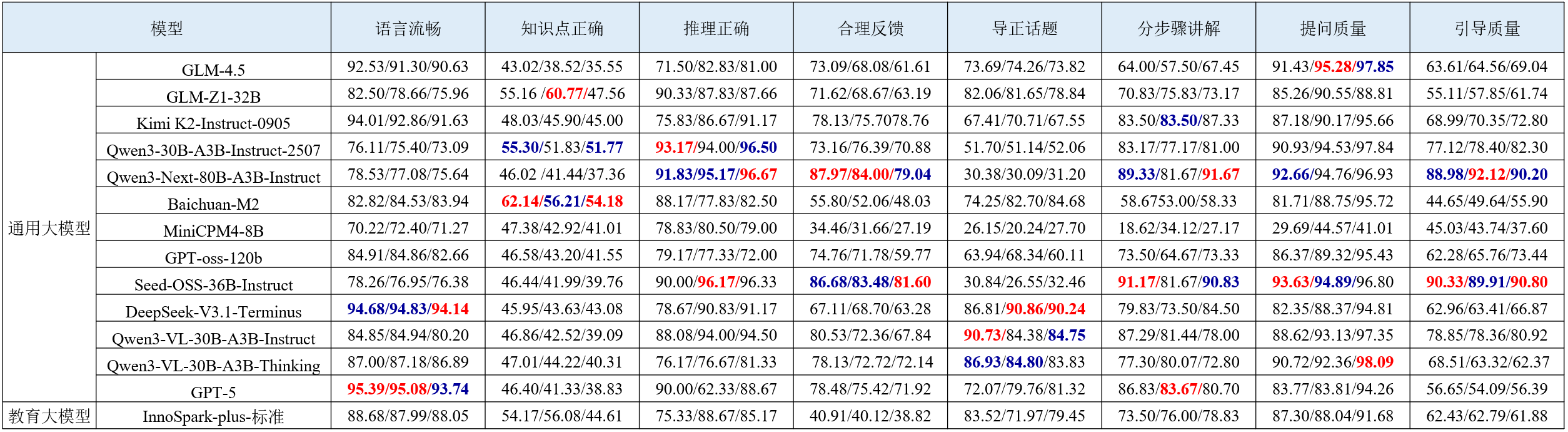 智能答疑评测聚焦大模型在基础教育教学场景中的实际应用能力,涵盖数学、物理、化学三大学科,围绕内容质量、互动反馈、启发引导三大方向构建包含8个核心能力维度的评测体系。评测结果如下表所示。