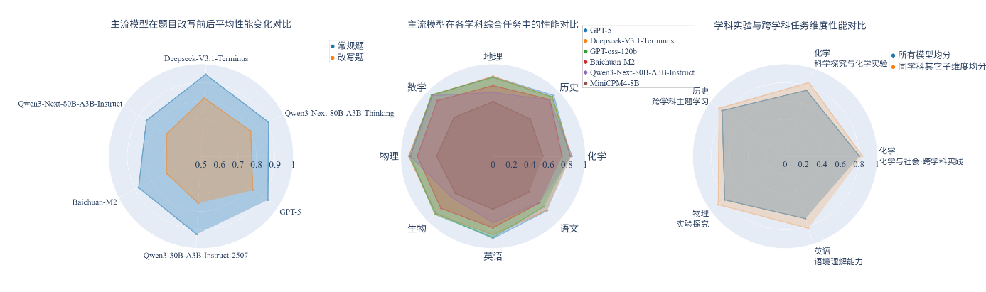 (3) 复杂情境化任务是模型短板。现有模型大多擅长解答有标准答案的知识类问题,但在需要主动探索、设计和构建知识的情境中则表现不佳。尤其在实验探究、交叉学科和复杂情景化任务中,模型难以将知识灵活迁移和应用,尚不具备在复杂真实情境中主动解决问题的能力。