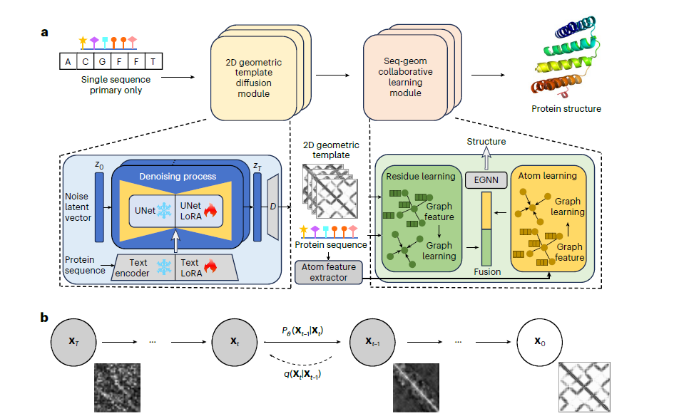 相关研究成果以《Two-Dimensional Geometric Template Diffusion for Boosting Single-Sequence Protein Structure Prediction》为题发表在Nature子刊《Nature Machine Intelligence》(IF=25.9),北京师范大学人工智能学院崔振教授为论文通讯作者。该工作得到了国家自然科学基金和中央高校基金的支持。