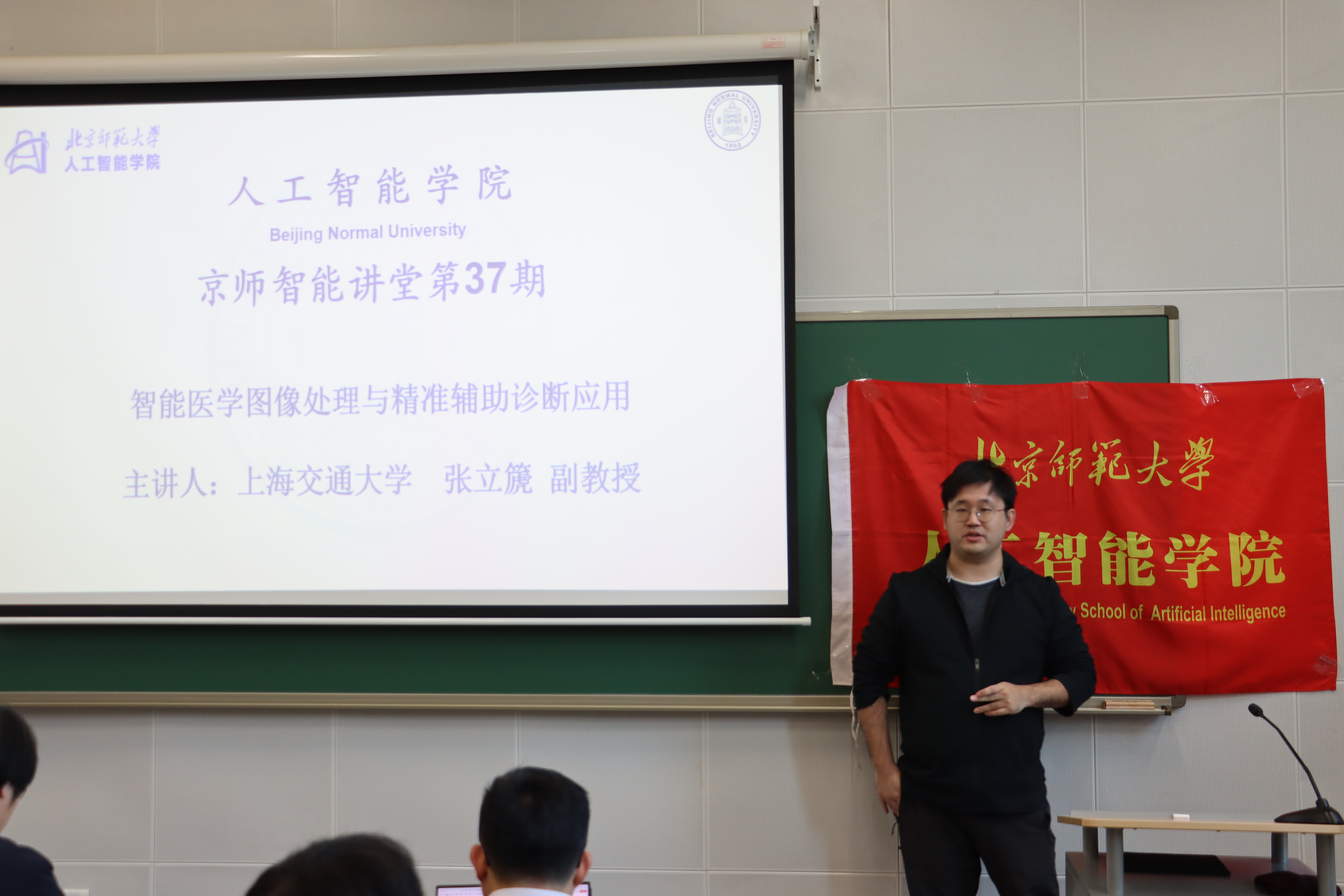 2025年11月18日,北京师范大学人工智能学院京师智能讲堂第三十七期在昌平校园2号教学楼108教室成功举办。本期讲堂邀请到了上海交通大学生物医学工程学院副教授、博士生导师、上海市浦江人才计划学者——张立篪老师,为师生带来题为 “智能医学图像处理与精准辅助诊断应用” 的精彩报告。讲座由人工智能学院白璐老师主持,学院研究生80余人次参与。