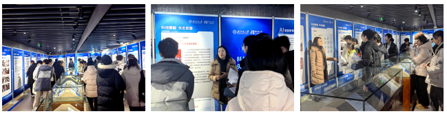 在校史馆中,同学们参观“传承科技筑梦报国志 奋进智能时代新征程”主题展览。展览由我院与档案馆(党史研究室、校史研究室)主办,教务部(研究生院)、党委宣传部(新闻中心)协办,全面追溯了人工智能从思想萌芽、学科确立到深度学习爆发乃至生成式AI普及的历史脉络,聚焦师大人努力科技报国的重要贡献。在廖英书记的细致讲解中,同学们进一步了解了学院为推动人工智能与教育深度融合的探索与贡献,进一步增强了归属感与自豪感。