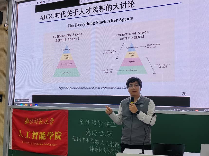 北京师范大学人工智能学院深耕“人工智能+教育”领域,依托教育部智能技术与教育应用工程研究中心等平台,持续开展前沿探索与落地实践,在智能教育理论研究、关键技术攻关及教学应用推广等方面积累了扎实成果。本次讲座正是学院在该领域系列工作的一次集中展示,旨在面向基础教育一线,分享前沿理念与实践经验,进一步推动人工智能与教育教学的深度融合。